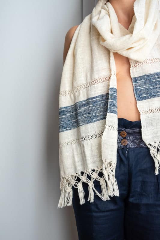 Jusqu’à présent, MUUDANA a utilisé selon les collections du du coton upcyclé, du lin et et la soie tissée main sur des métiers à tisser traditionnels. Certains articles de de certaines collections ne vous conviendront donc pas si vous avez un mode de vie végane. En fait, les matières premières utilisées changent selon le pays de production et ses « spécialités » : par exemple, au Cambodge, pas de culture de coton, donc pas de coton dans la collection!). Pour le tissu upcyclé, MUUDANA achète des chutes de coton aux nombreuses manufactures textiles du Cambodge qui confectionnent les vêtements de marques internationalement connues (le fameux « made in Cambodia des étiquettes de vos vêtements »). Cette solution permet d’avoir un coton de moindre impact environnemental puisqu’il n’est pas fabriqué pour Muudana qui achète simplement les chutes inutilisées par d’autres marques.