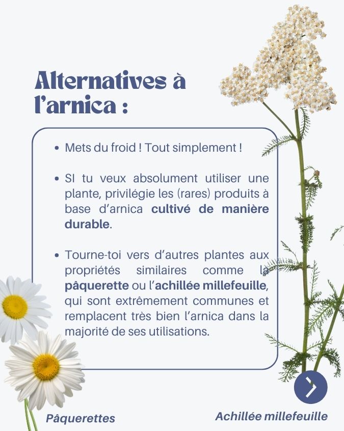 - Des alternatives très communes : la pâquerette et l’achillée millefeuille remplacent très bien l’arnica dans la majorité des usages “petits chocs et inconforts”.