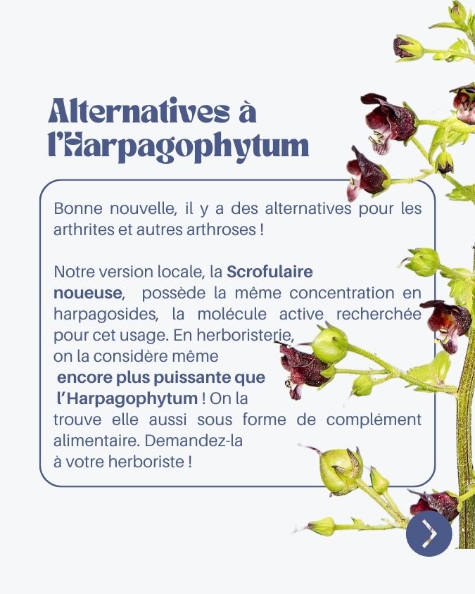 Bonne nouvelle : il existe des alternatives. Dans une logique d’herboristerie plus locale, on cite parfois la scrofulaire noueuse comme option intéressante dans certains contextes articulaires. Elle est considérée par certain.e.s praticien.ne.s comme une plante de terrain précieuse. On peut la trouver sous forme de compléments dans certains circuits.