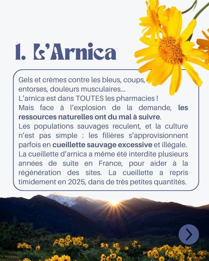 Les populations sauvages reculent, et même si l’arnica peut être cultivée, la culture n’est pas simple du tout et les quantités produites restent très anecdotiques par rapport aux quantités demandées sur le marché. Dans certains contextes, les filières s’approvisionnent aussi en cueillette sauvage excessive, parfois en dehors des règles, ce qui met encore plus de pression sur la plante.