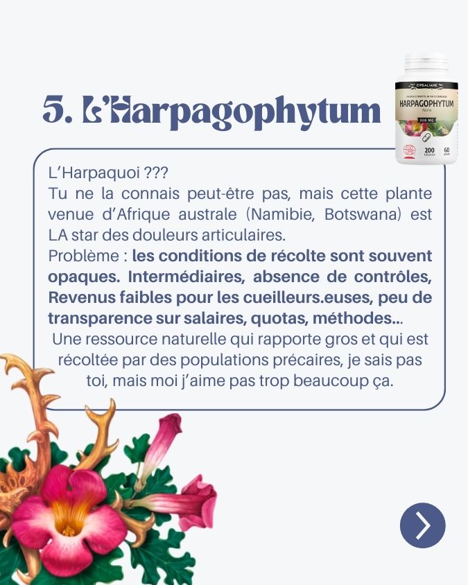 L’harpagophytum, tu ne le connais peut-être pas, mais c’est une star des douleurs articulaires. Il vient d’Afrique australe (notamment Namibie, Botswana) et il est très présent en gélules ou compléments. Le problème : les conditions de récolte sont souvent opaques. Intermédiaires, absence de contrôles, faibles revenus pour les cueilleurs.euses, manque de transparence sur les quotas, les méthodes, les salaires… tout ça existe et rend le choix difficile pour le consommateur.