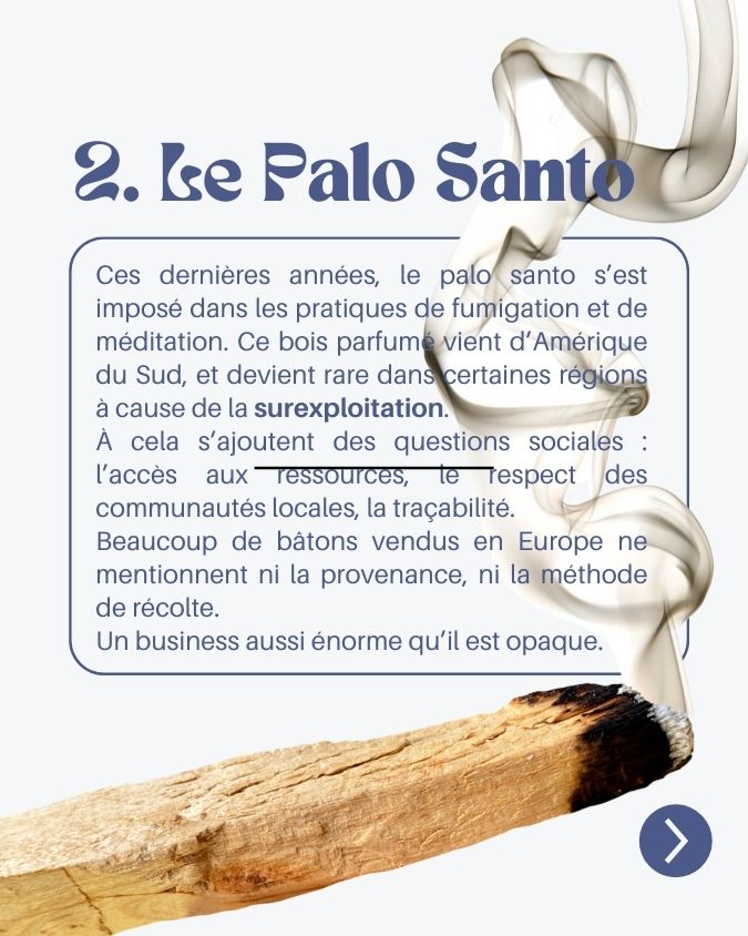 Ces dernières années, le palo santo s’est imposé dans les pratiques de fumigation, méditation, “purification”, et tout ce que le marketing new age a charrié avec lui de modes empreintes d’appropriation culturelle. Ce bois parfumé vient d’Amérique du Sud et devient rare dans certaines régions à cause de la surexploitation.