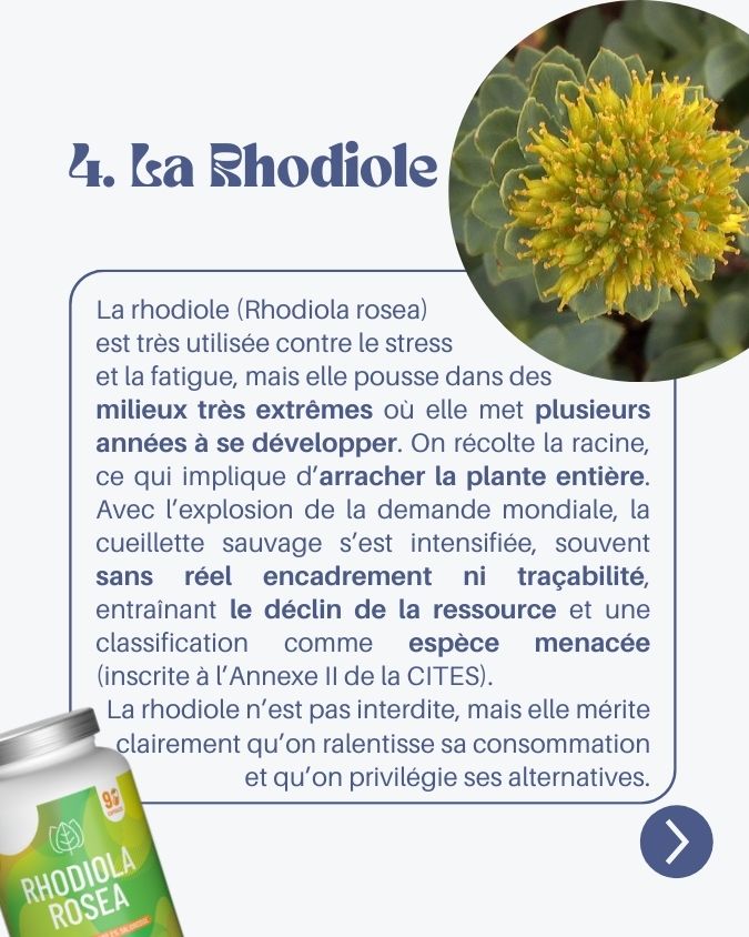 La rhodiole est très utilisée contre le stress et la fatigue. Elle pousse dans des milieux très extrêmes et met plusieurs années à se développer. Et surtout, on récolte la racine, ce qui implique d’arracher la plante entière. Quand la demande mondiale explose, la cueillette sauvage s’intensifie, souvent sans encadrement solide ni traçabilité, entraînant un déclin de la ressource.