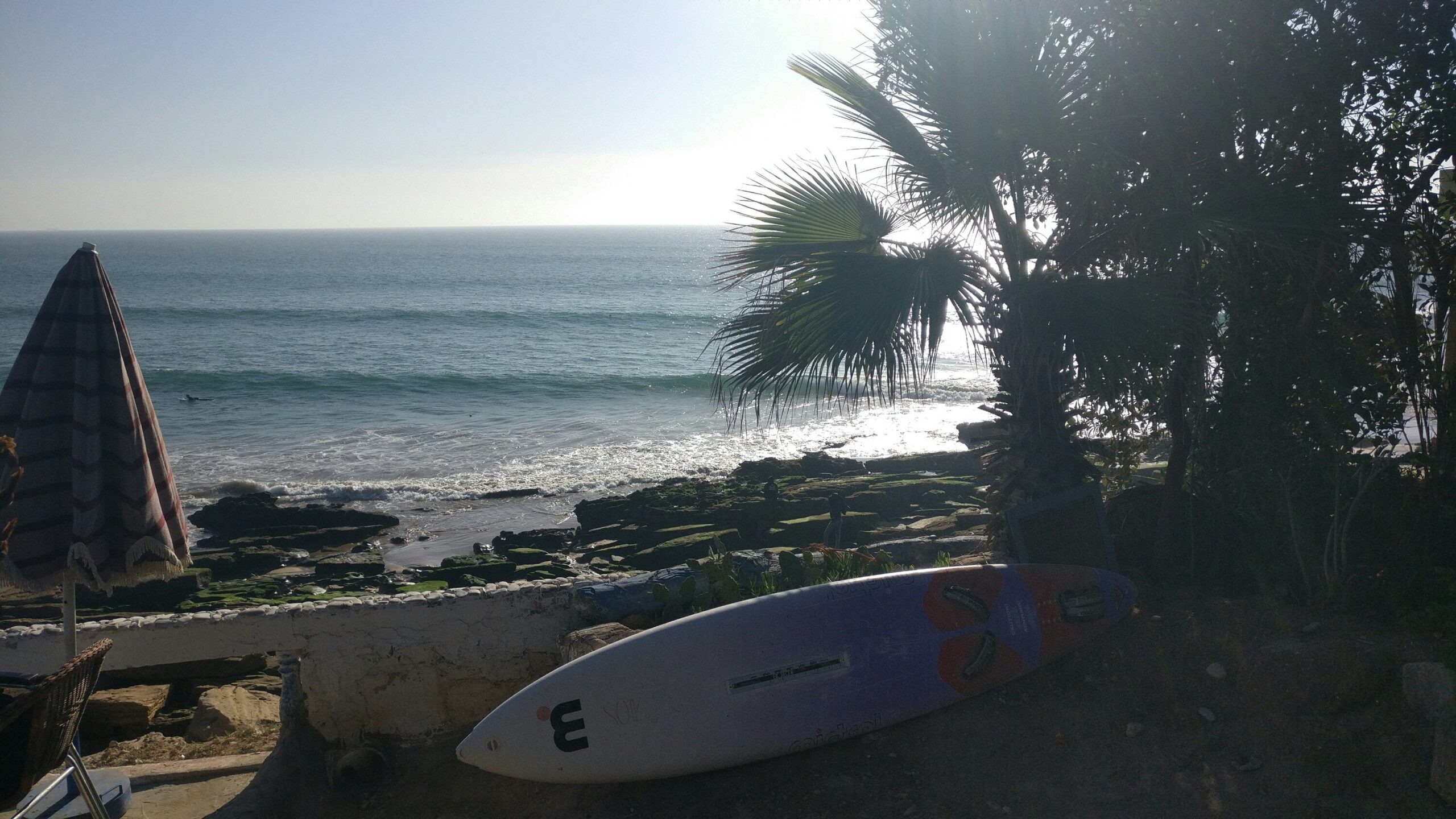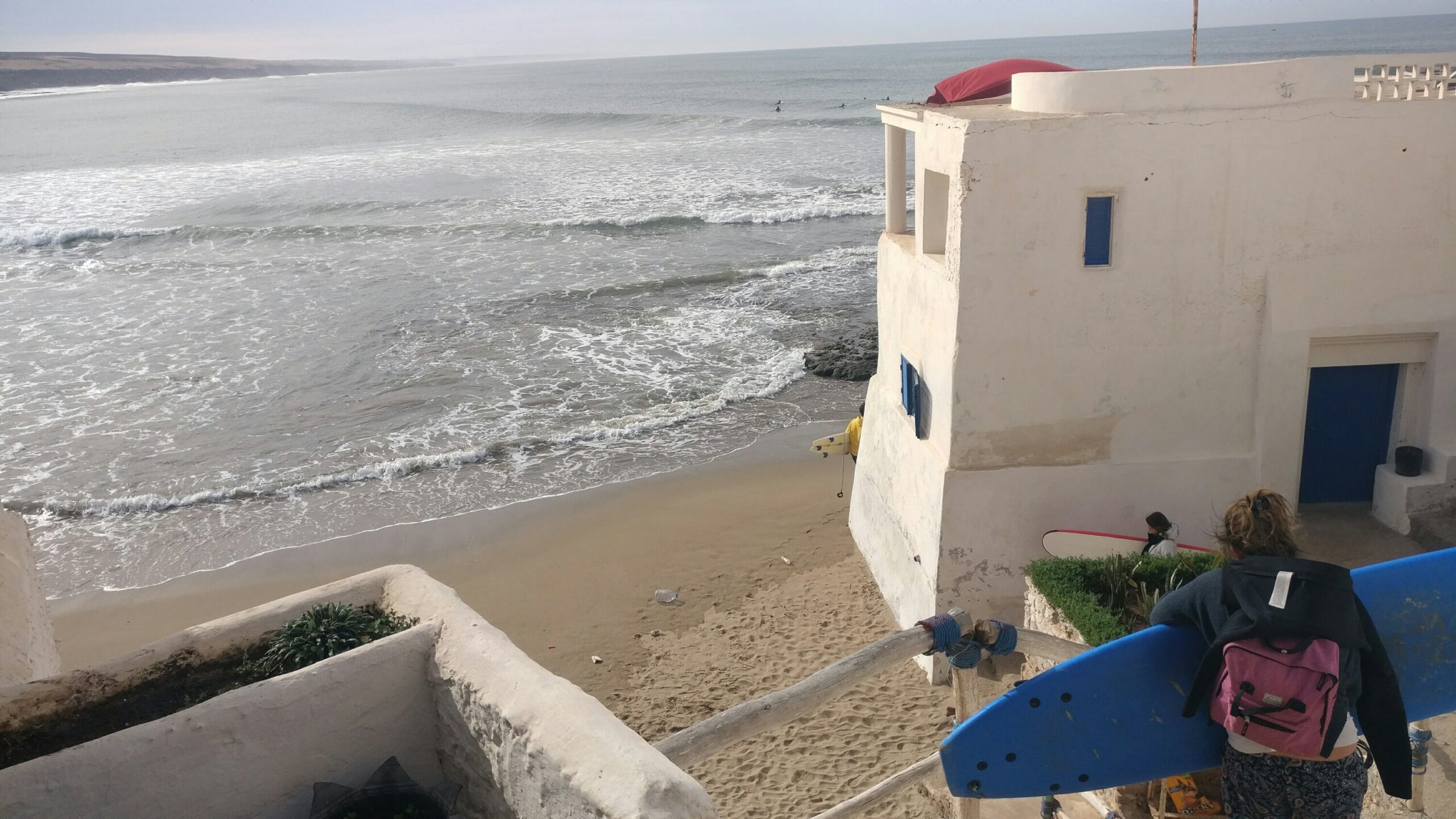 Nous avons été logés les premiers jours au Riad Imourane à Tamraght, un ravissant Riad coloré et fleuri avec de magnifiques terrasses ensoleillées où il fait bon prendre son petit déjeuner le matin. Puis, lorsque nous avons été assez nombreux, nous avons eu droit à une superbe maison partagée avec d’autres surfers (des italiens très sympa). La nourriture était locale et excellente. Le midi, un petit picnic sur la plage, idéal entre deux sessions, et le soir une multitude de délices locaux préparés avec amour par les cuisiniers du Riad ou bien à la maison par Fatima, amie de longue date de Haytam. Fatima est une déesse des fourneaux et fabrique aussi sa propre huile d’argan que l’on peut lui acheter. Si vous avez un régime spécial il suffit de le préciser et la cuisine sera adaptée à vos besoins !